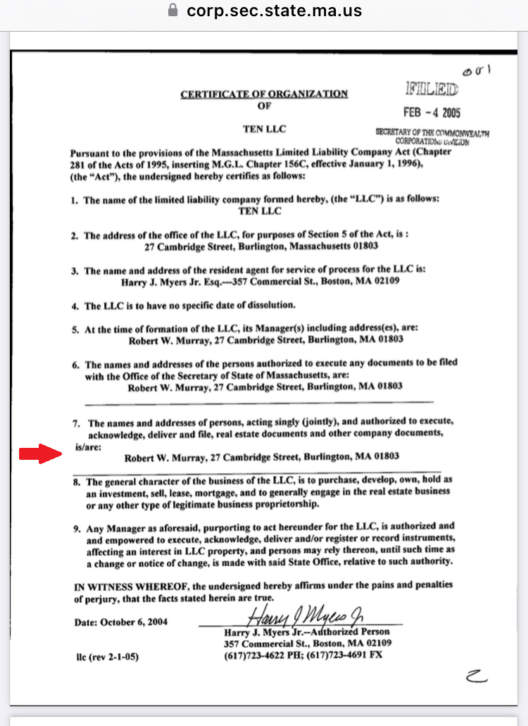 Murray is described in some documents as the "manager" of Ten LLC. He is also the manager, but not only the manager. He is the resident agent (person who receives all corporate communications), and "the person authorized to execute ... any recordable instrument". He also signed Ten LLC's annual report. Click here to search for corporate documents at the on the State Secretary's Corporation page.
